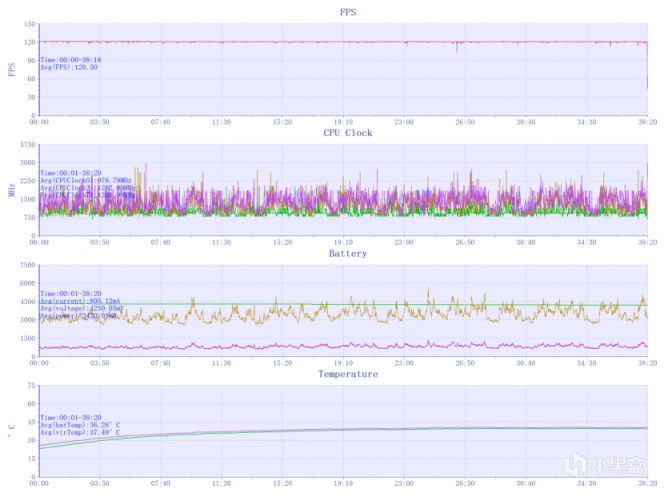 那王者荣耀也不再是问题,开到极高帧率、超高分辨率、极致画质,38分钟玩下来平均120fps满帧跑。