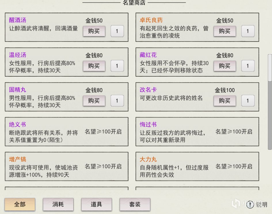 其中商品包括但不限于装备,武将(可自定义性别姓名),药品,军队等,是只属于玩家的“系统”