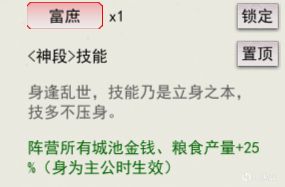 这些技能作用于当你作为主公,太守,亦或是武将时,你所在的城池的资源或人口兵力,例如