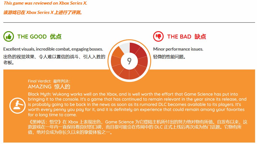 GamingBolt 於 2025-08-25 發佈了 Xbox Series X 版的評測,給出的總體語氣是高度肯定(頁面最終評語爲 “AMAZING” / 最終結論推薦)。評測作者強調:畫面、戰鬥和 Boss 設計都很出色,Xbox 版“總體上能把遊戲的各項體驗很好地帶上來”,值得入手,評測對象爲 Xbox Series X。