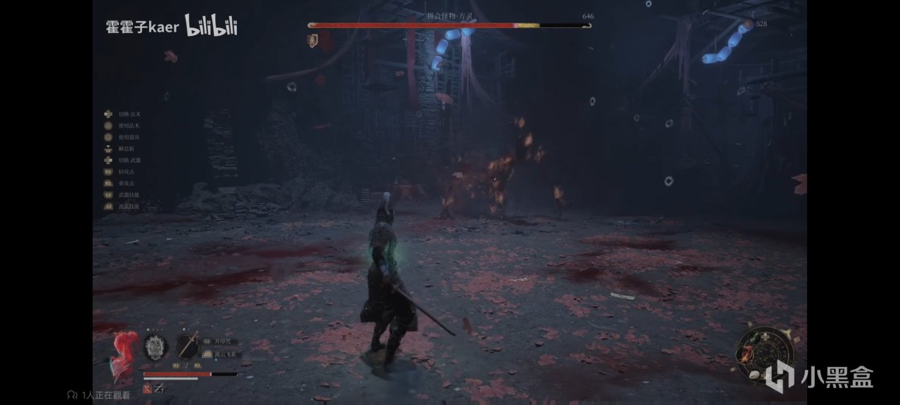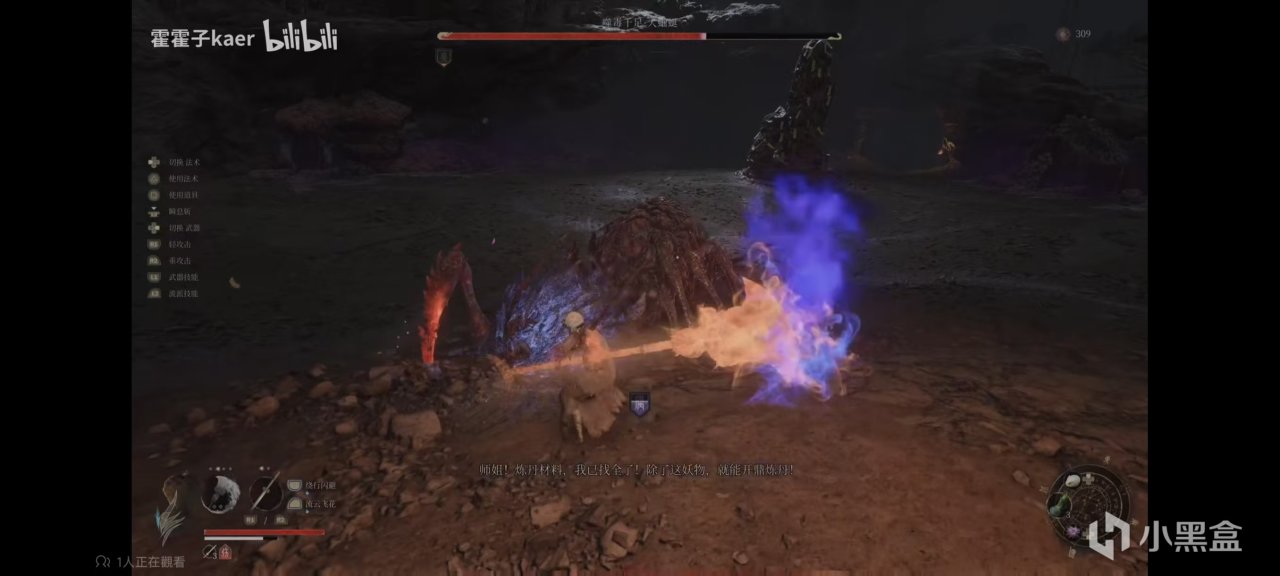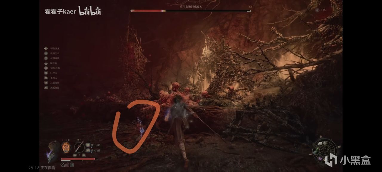 如果不看攻略遇到了必吃大亏,建议是先绕道上去开篝火再回来打,用连珠火就能打了,虽然是多动怪但是场地狭小很难躲避我们的法术攻击所以连珠火就够了,猛猛闪避攒羽毛就能初见杀,小心的是不要让障碍物挡住连珠火否则羽毛就白攒了。