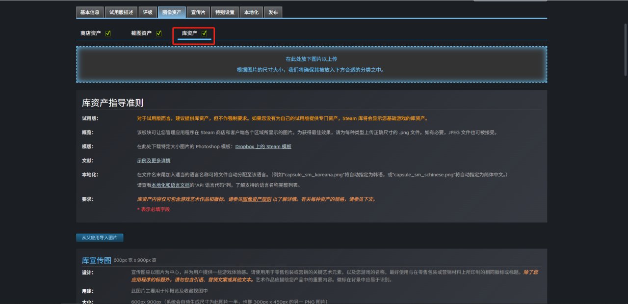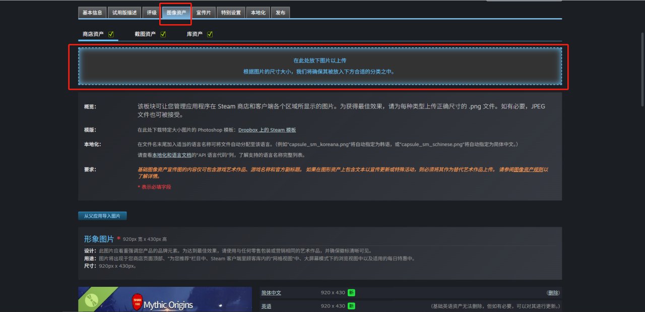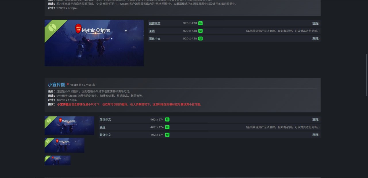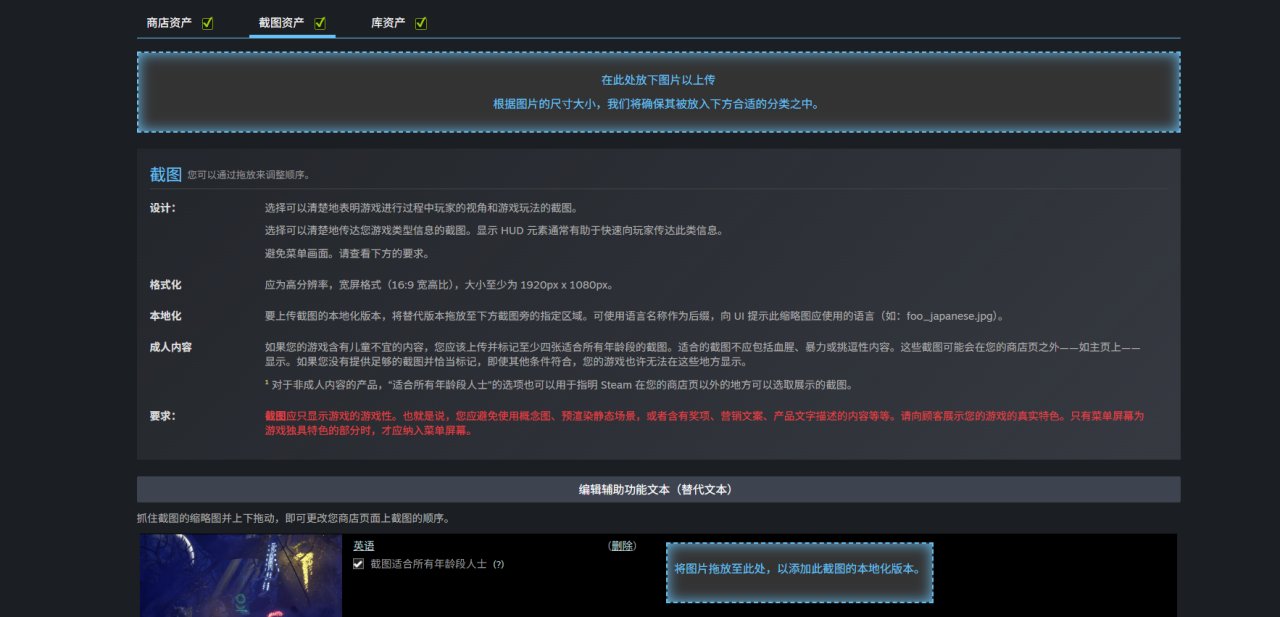當你覺得要大功告成的時候,結果還有圖像資產需要製作,需要按照標準尺寸製作對應的商店物料。然後放到那個大的藍色框子裏,根據多國語言設置圖片後綴名,Steam會自動根據圖片尺寸和名字後綴給安排到對應的地方去。