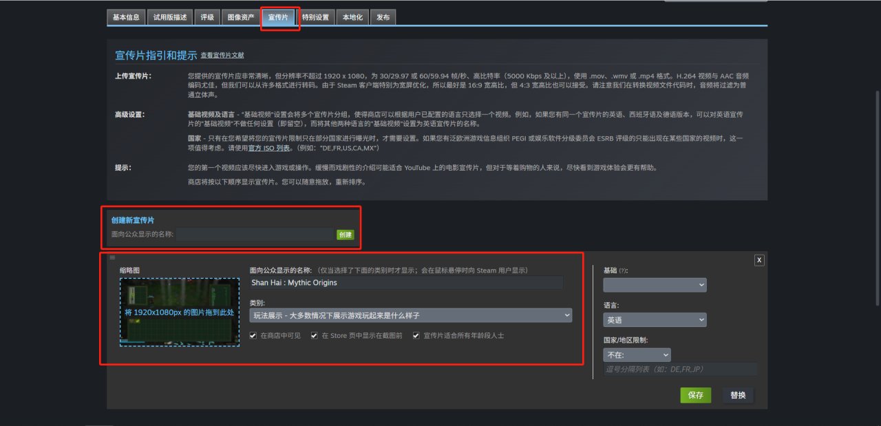 別急還沒完,還要上傳一個宣傳片,最好是一上來就介紹玩兒法,讓玩家能夠一眼看明白你的遊戲怎麼玩兒。視頻也是可以設置多語言的,可以排查一些地區,或者只能一些地區看。