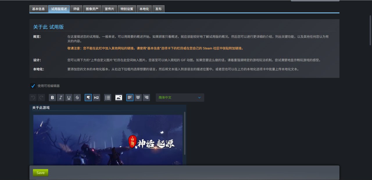 不經常在Steam上賣遊戲的人應該就不知道接下來纔是繁瑣頭疼的時候了。接下來就要給試用版做描述了!!!!進入“試用版描述”,這個和正式版操作方法是一樣的。