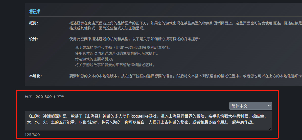 好了,當你花了非常多的時間完成了遊戲商店的描述後,下面記住,還有簡介需要編寫,大家看到這裏可以輸入最多300字符,對中文是相當友好,但是,有但是啊,就是一旦你寫太多,再翻譯成了其他語言,就可能一瞬間超標,所以看我這裏控制在了125個字,這樣的話翻譯過去就不太會超標。