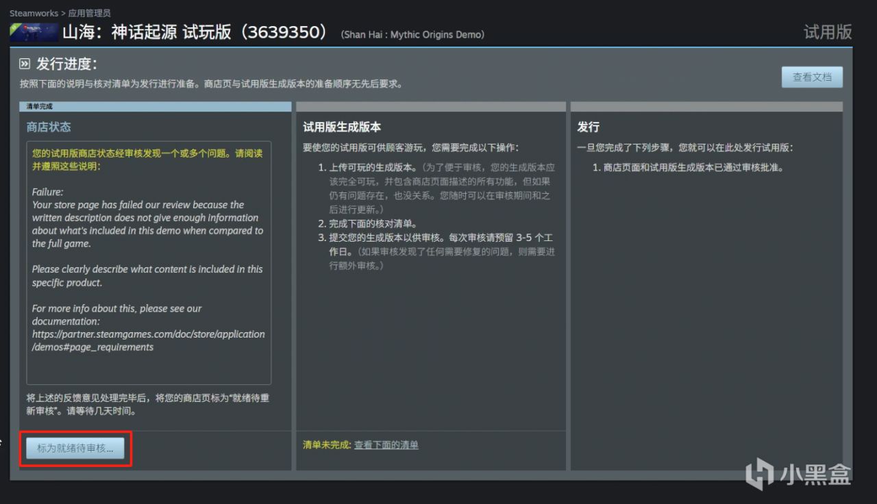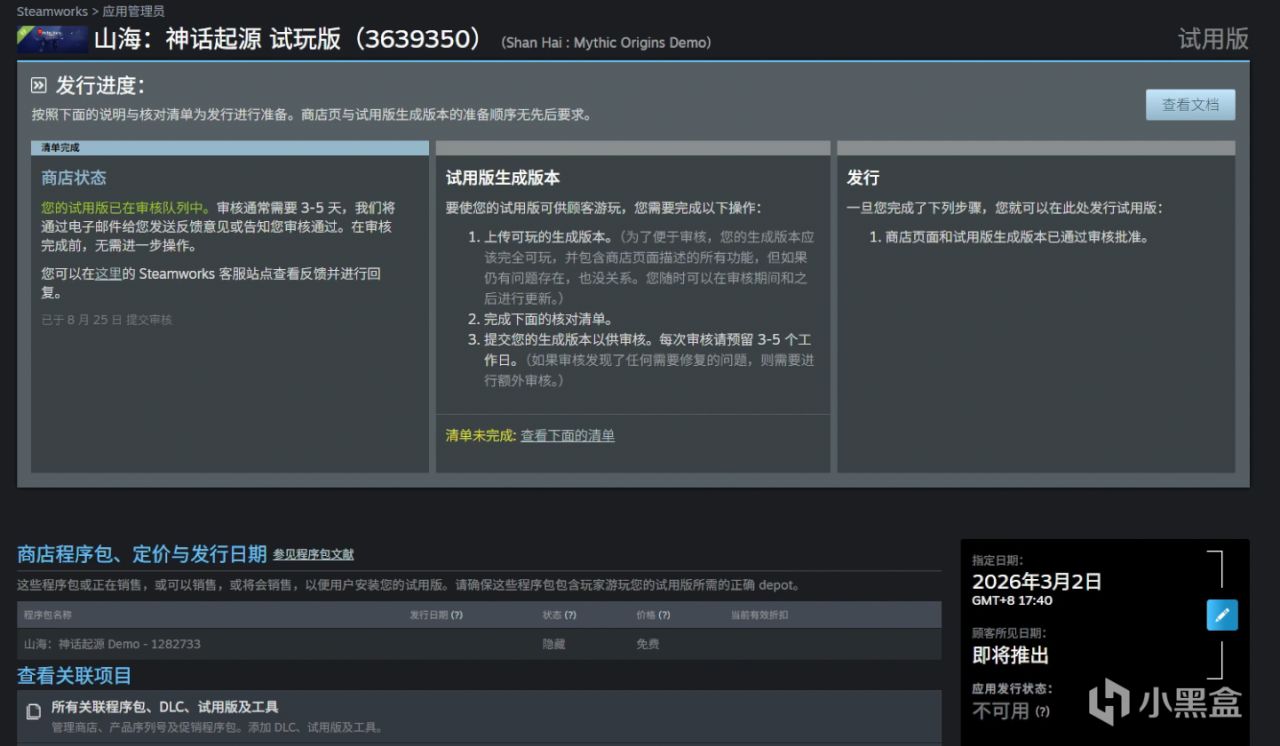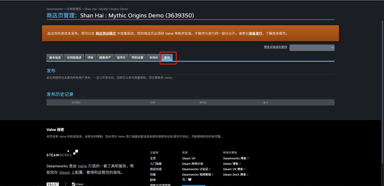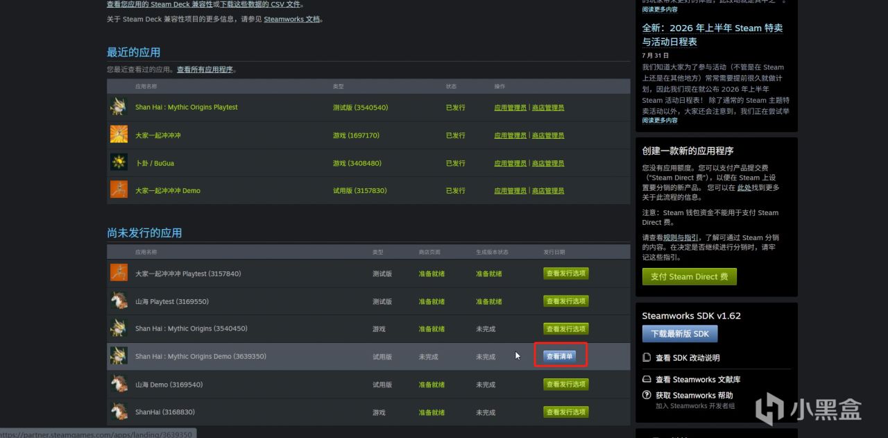 以我們遊戲《山海:神話起源》正要發去審覈的DEMO版爲例,找到對應的遊戲,點擊遊戲名字的一長條任意位置。(我們需要把DEMO版本的商店頁面做完才能提交審覈,所以下面都是未完成)現在Steam可以給Demo單獨生成頁面了,這樣的商店頁面可以獲得單獨的評價。