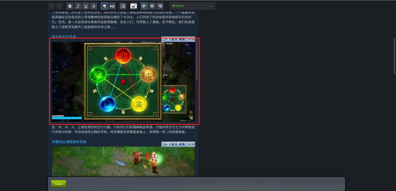 這裏分享一個技巧,就是現在Steam這個描述內容裏面是可以插入視頻的了(是沒有聲音的那種),比以前的GIF效果更好,但是要注意這裏是遊戲的介紹頁面,所以不要把圖片,GIF或者視頻弄得特別大,看遊戲的玩家半天打不開就離開了,建議1MB左右,視頻720做到VBR1就差不多了。這樣遊戲介紹裏也有高清畫面了,不像以前都是像素顆粒感的GIF動畫。