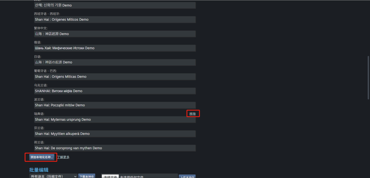 進去後你可以鼠標停留在某處然後點擊“移除”刪除該地區語言,或者點擊“添加本地化名稱...”添加更多的語言。