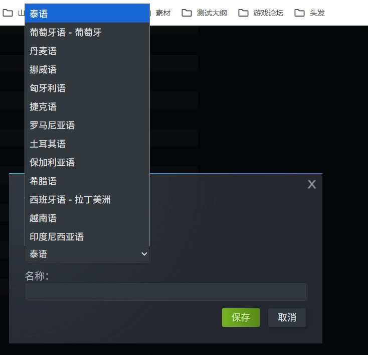 點擊了以後就會出現還未選中的語言,選中後點“保存”就添加了對應語言,然後只需要在下面“名稱”的輸入框內輸入對應的該地區遊戲名稱就行。