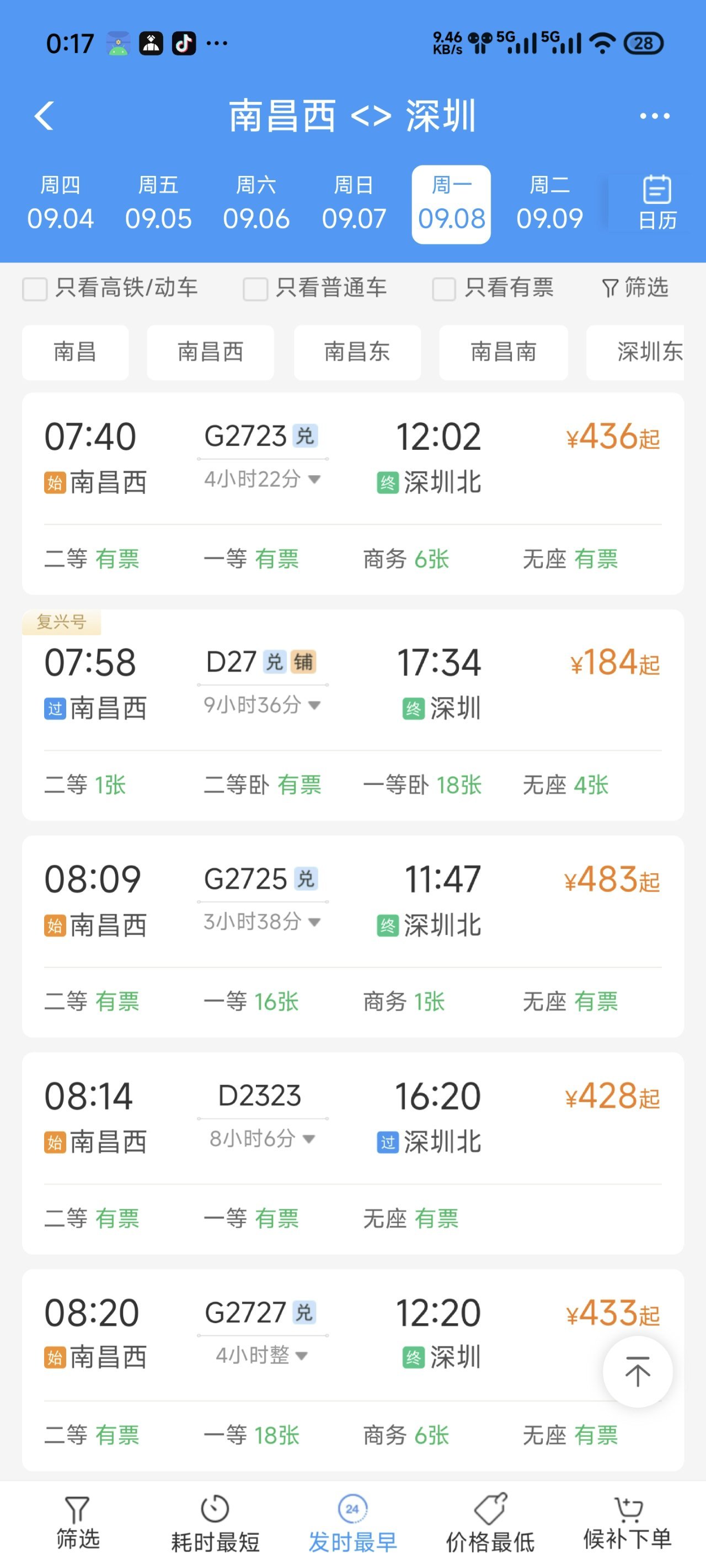 南昌西到深圳有1張票(由於9月7日開行的D27次列車到達南昌西時已經是9月8日,所以需要搜索9月8日的票)