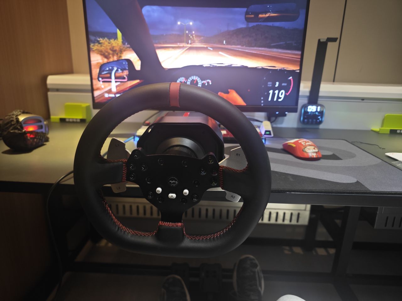 我一直觉得无论是用键鼠、甚至是带有扳机震动的手柄,玩开车游戏总有在操作层面有一种不可逾越的差距。毕竟真实开车需要手脚并用扭方向盘,但是用键盘和手柄,游戏的操作仅仅停留在指尖的程度。