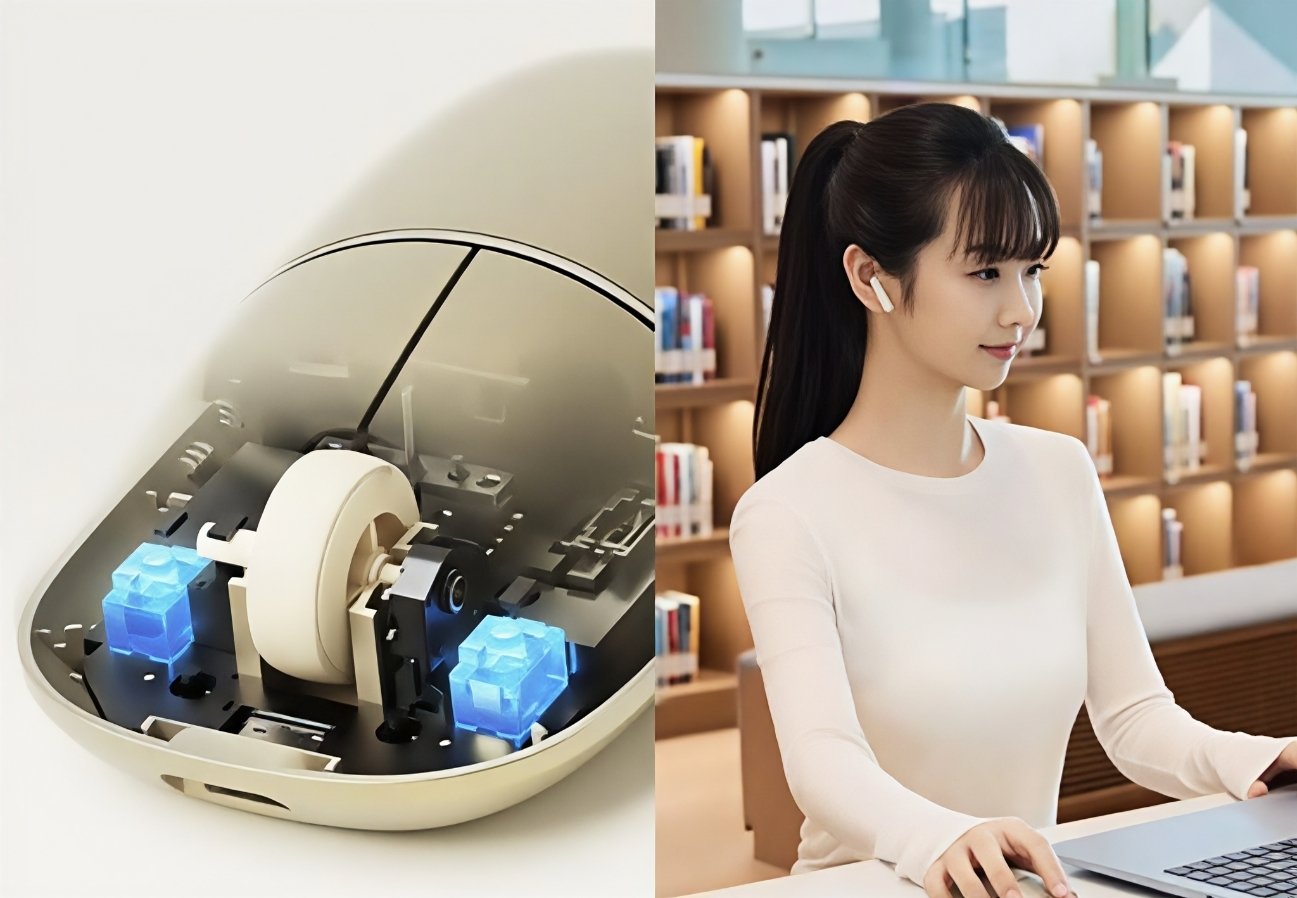 鼠标模具为扁平设计,背部作为耳机充电仓,滑动可取出耳机。