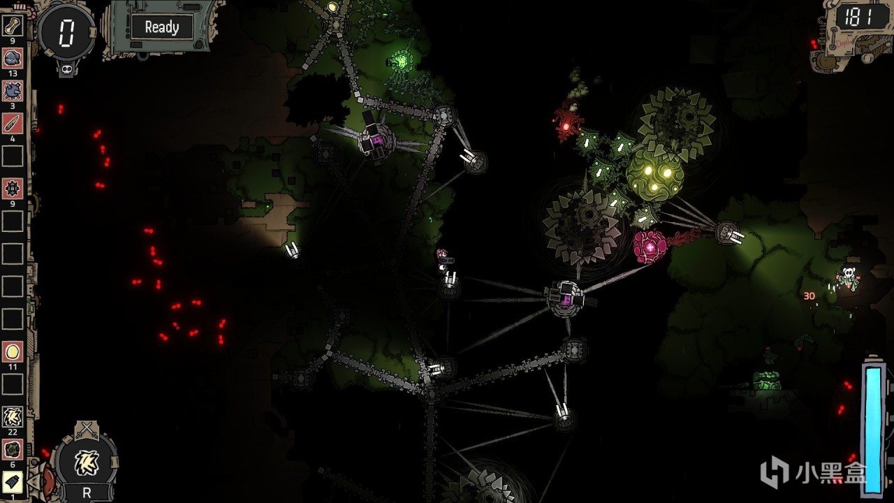 塔防建造與移動堡壘:通過收集資源,利用自定義融合炮塔系統打造獨一無二的防禦工事,如無人機工廠、迫擊炮等,遊戲前期,炮塔是主要的輸出手段,玩家甚至可以組合裝備形成一個巨大的移動堡壘,駕駛它橫穿地下,摧毀來犯之敵。