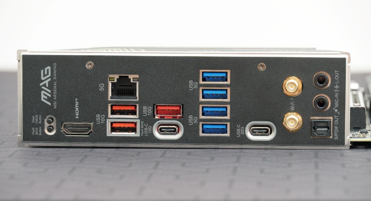 最后我们再来说一下微星MAG B850M MORTAR 迫击炮 WIFI主板的IO接口。这款主板采用了一体式IO面板,装机更加轻松,从左到右分别是HDMI 2.1接口、5G网口、USB 3.2 Gen2x1(10Gbps)接口4个(其中3个Type-A、1个Type-C),4个USB 3.1(5Gbps)接口,1个USB 3.2 Gen2x2(20Gbps)接口与包括光纤音频口在内的一组音频接口。