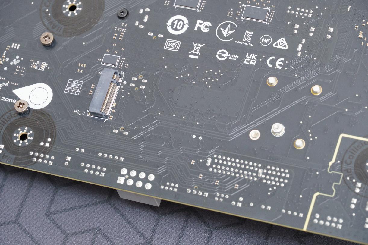 而在主板的背面,还有一个M.2 固态硬盘接口,其规格为PCIe 4.0x2,且没有散热装甲覆盖,因此除非硬盘空间实在捉急,否则不建议使用这个SSD插槽。