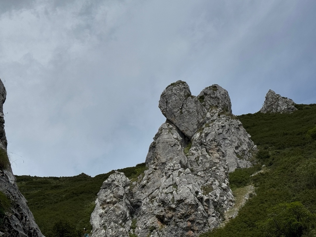 然后又是一段超级大上坡,图片这个上坡过了之后可以看到一个爱心岩石很漂亮,过了这个坡的另一个斜坡队友软件测了坡度是35度,我真有点累了,到这个上坡的前一段是一片草地林地的感觉,路难找