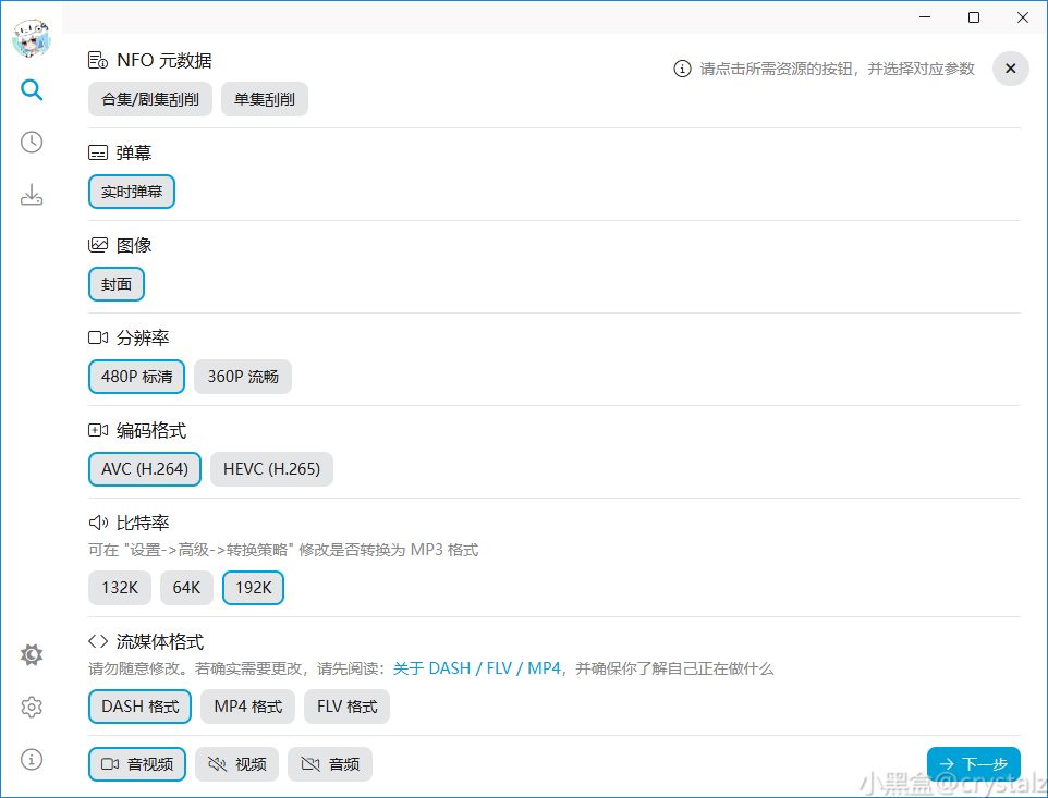 下载 DASH 格式时,需要点选下面的音视频、视频、音频格式后,再点击下一步。