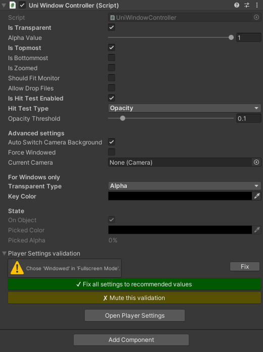 点击UniWindowController改脚本的参数,上面的英文就是对应的功能。IsTransparent要勾选,用来做透明底显示桌面,IsTopmost看情况,用来置顶桌面宠物。