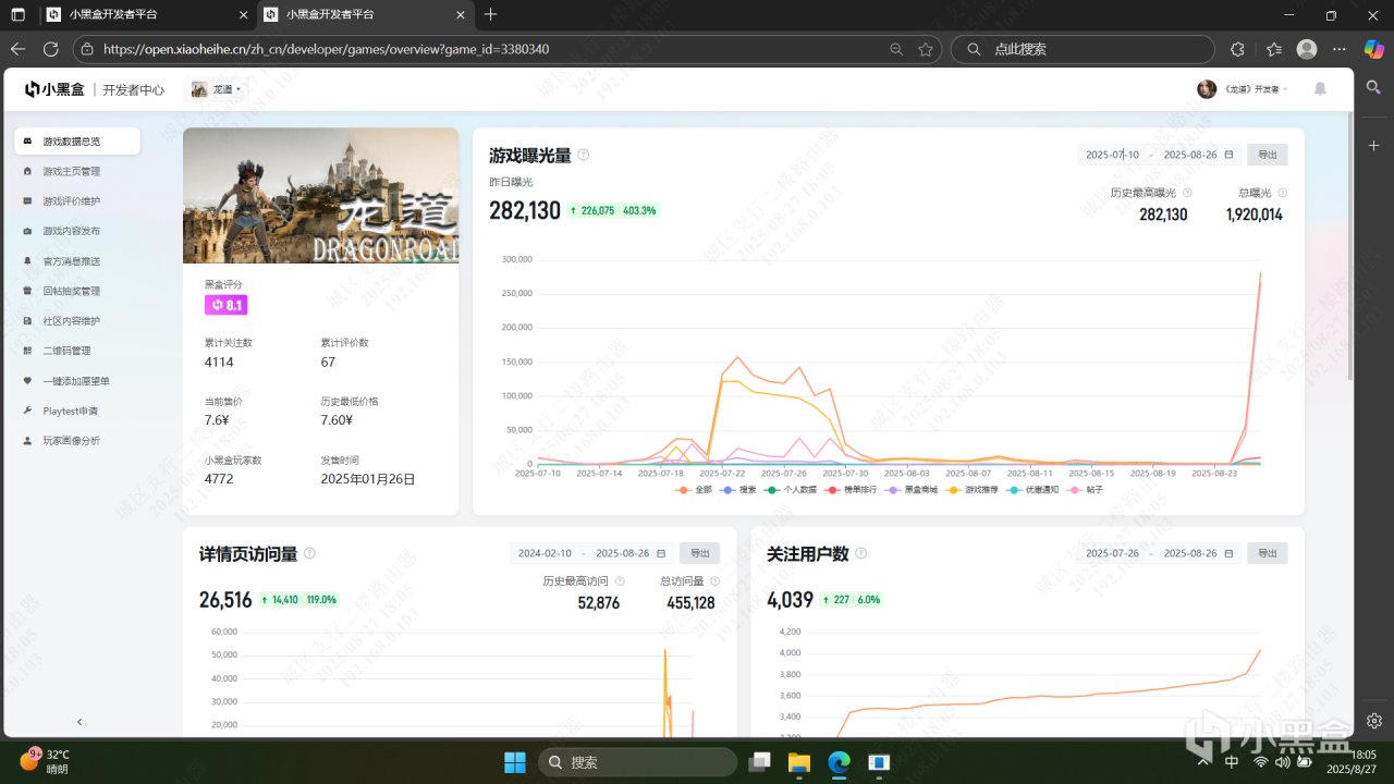 从 7月18日开始至今,也就是小黑盒举办夏促活动,《龙道》游戏被无意间打落至一折史底价7.6元开始,小黑盒和Steam平台火眼金睛,真眼识货,像挖掘出了《龙道》游戏的潜在价值还是发展潜力似的,疯狂推荐《龙道》,仅仅小黑盒一家日推荐曝光量一直维持在10万人次至30万人次之间,热度非凡。