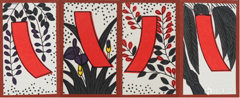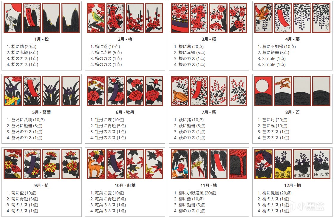 花札全套共48张牌,代表了一年中的12个月份,每个月份下有4张牌。这不仅是牌面的主题,也是游戏中最核心的匹配规则——你只能用代表相同月份的牌来吃掉场上的牌。不必担心12个月份难以记住,因为每个月份都有其对应的植物,仅从外表就可以分辨大部分同月份的牌,只需要记住部分比较特殊的牌就能解决所有问题。