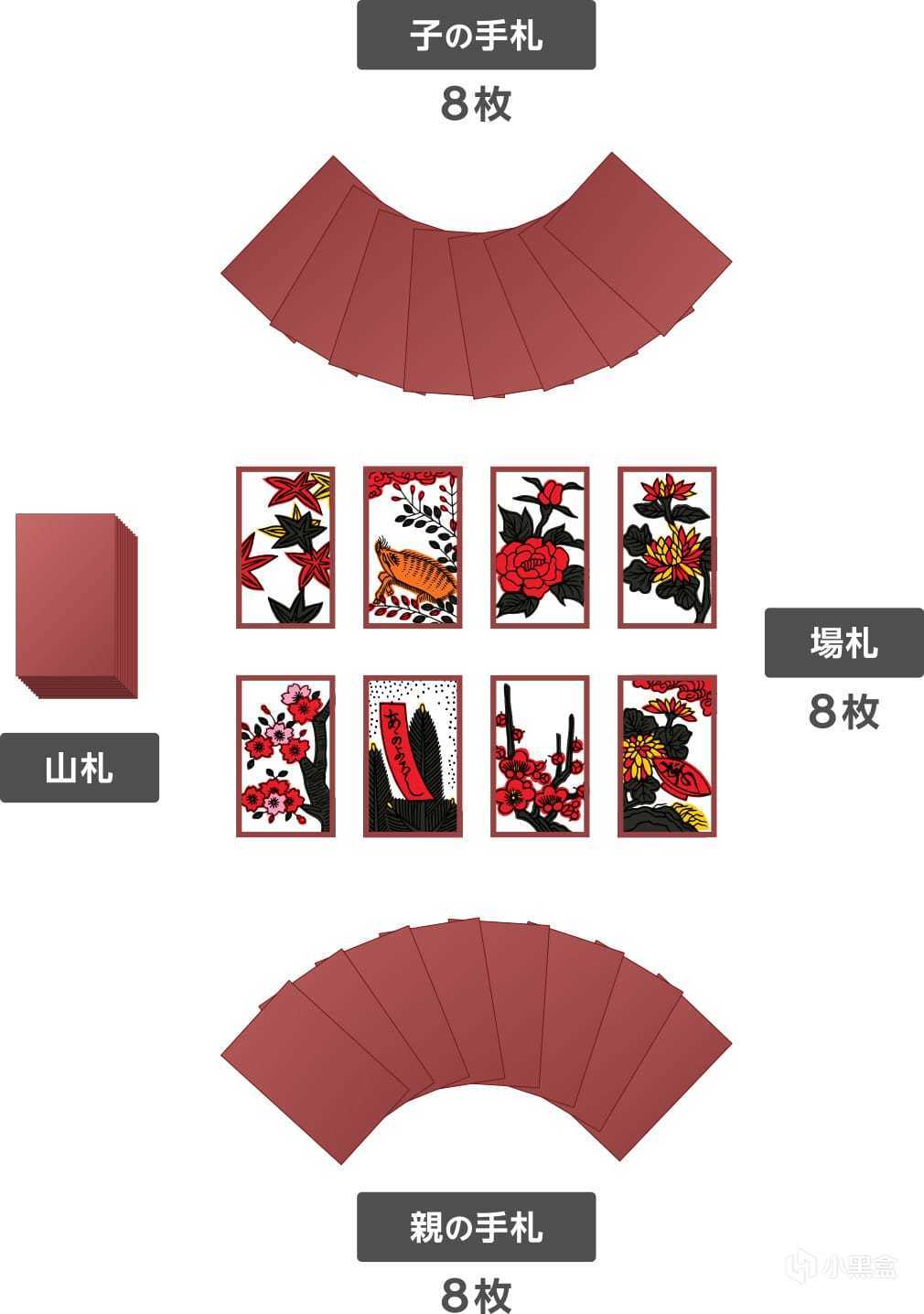 在桌子中央亮出8张牌,这片区域被称为“場(ば)”,这些牌被称为“場札”即“场牌”。