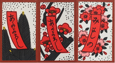 赤短册(有文字):共3张,分别来自1月(松)、2月(梅)、3月(樱)。