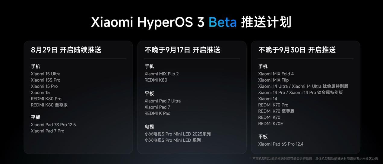 目前,HyperOS 3已经开启Beta版推送计划,包括小米15系列、K80 Pro、K80至尊版在内的多款机型将于29号起开启更新推送。