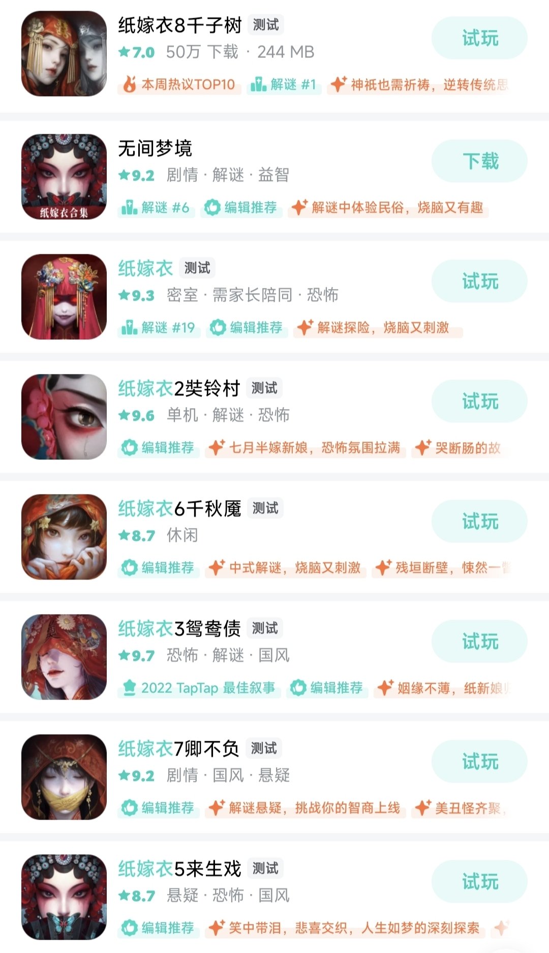 作为国产恐怖游戏最稳定IP之一,纸嫁衣系列一直以中式恐怖与精彩叙事的完美结合、高质量的人物建模、烧脑的场景解谜吸引了大批玩家。同时也影响了一系列竖屏恐怖解谜游戏的制作。但是纸嫁衣系列的最新作品《纸嫁衣8千子树》(以下简称纸8)却在7月4号发布后引发巨大争议,各APP上的评分明显低于前作,甚至在B站已经跌到6.0分,接近不及格。玩家中"重做"声浪接连不断。在该系列发展过程中也有部分作品因剧情解谜难度人物塑造等方面而影响口碑,但从未像纸8这样完全失了水准。