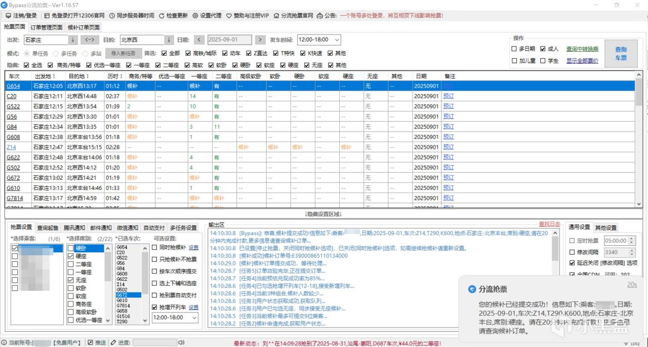 经过测试,在抢票时建议多勾选几个车次,同时将抢候补勾选上,然后就可以挂在后台等着。