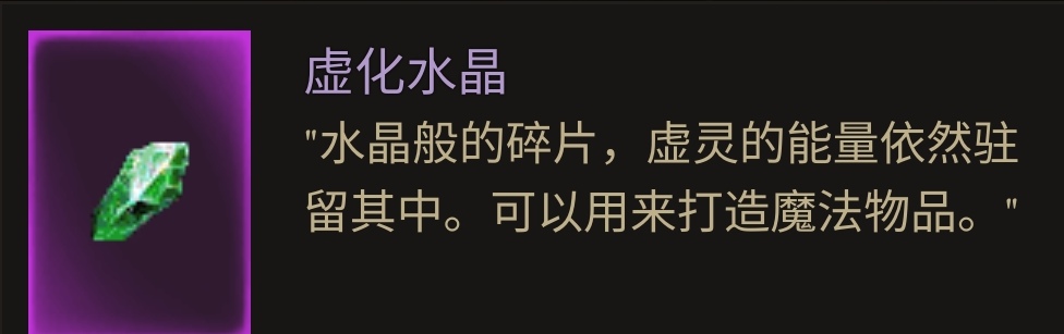 这个很重要,因为后期很多高级物品是由大量的中低级物品合成的,而中低级物品绝大部分都需要虚化水晶。导致这个东西的消耗量指数级上涨,当你玩到第二,第三个档的时候这东西就很缺。