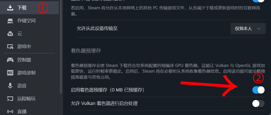 2. 在【下载】选项中,找到 “启用着色器缓存” → 将它关闭。