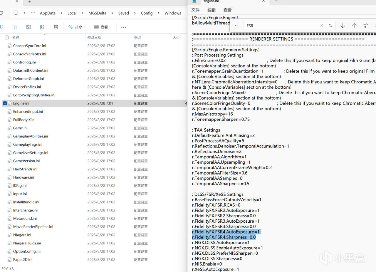 對於A卡而言,在《合金裝備 Δ:食蛇者》的Engine.ini配置文件中能清晰看到遊戲已做好對於FSR 4技術的底層準備,不過現階段僅支持到FSR 3且沒有幀生成功能,同時FSR Native AA支持也是缺失的。
