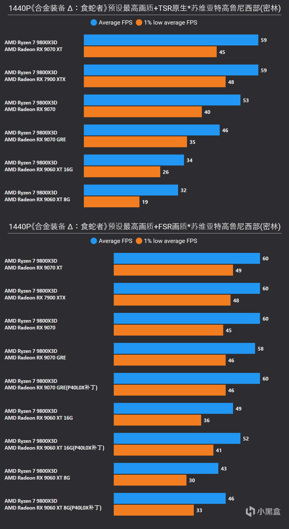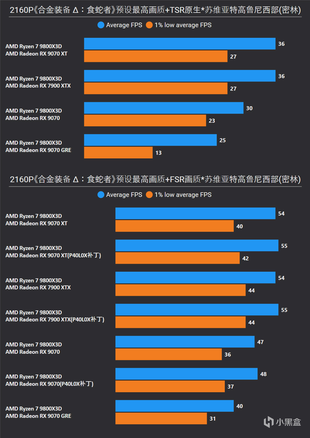 關於Nexus Mods網站認證大神【P40L0X】,各位可自行去查看使用方法,他針對不少虛幻引擎5遊戲都發布了性能補丁,這次硬核也針對《合金裝備 Δ:食蛇者》進行了補充測試,並把數據加入FSR畫質這種日常情況方便對比(不同顯卡對應不同分辨率),以下都是鎖60+預設最高畫質的數據。