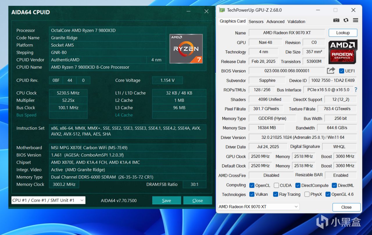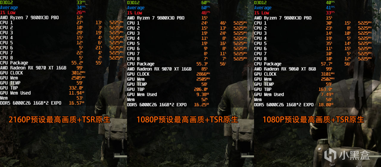 配置環境方面,CPU是銳龍7 9800X3D設置PBO ENABLE,主板是微星MPG X870E CARBON WIFI暗黑,搭配兩根DDR5 6000C26 16*2內存套裝,最大程度降低CPU性能瓶頸。操作系統是Windows 24H2最新版本,顯卡驅動是AMD Adrenalin 25.8.1最新版本,暫時沒有對《合金裝備 Δ:食蛇者》有針對性優化。
