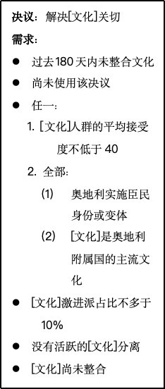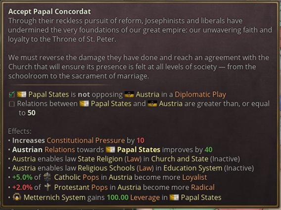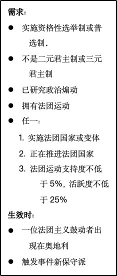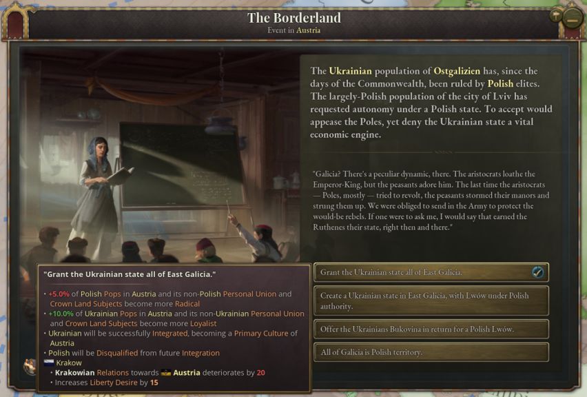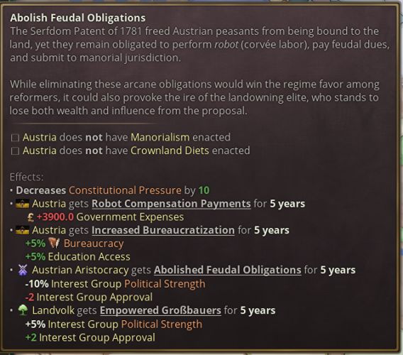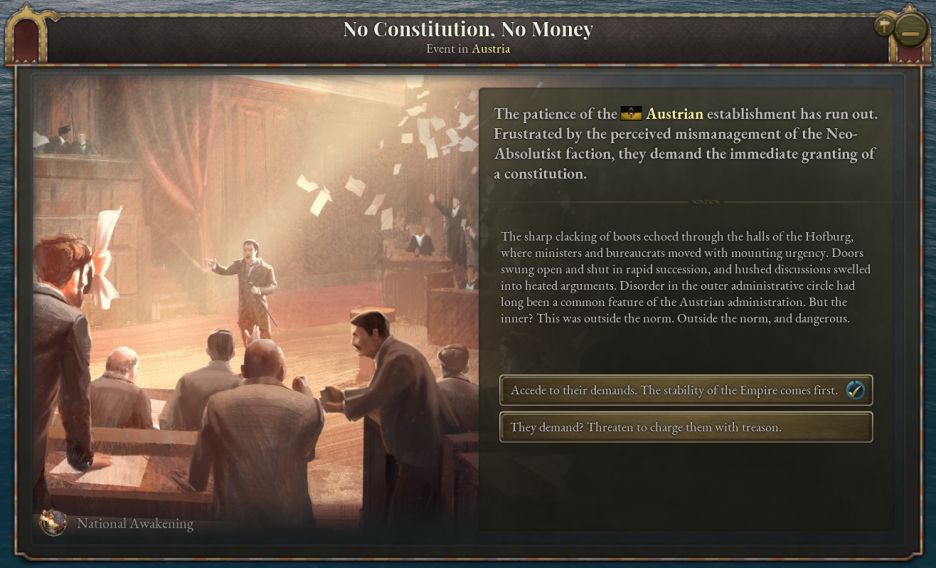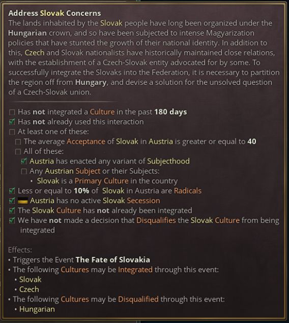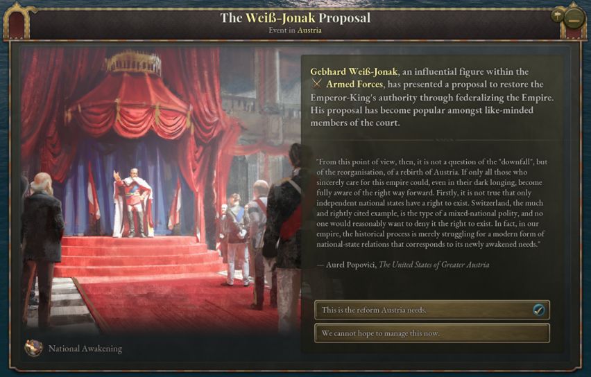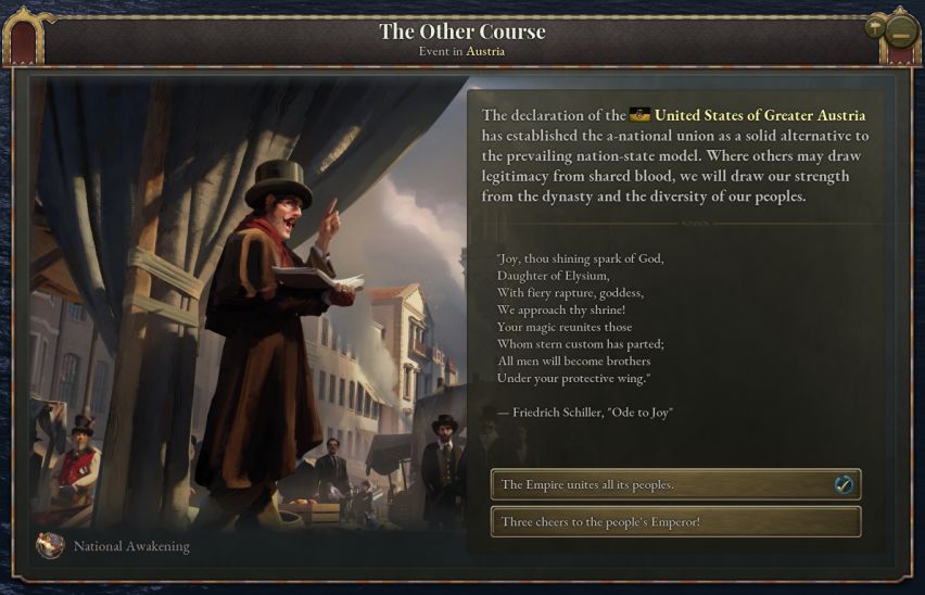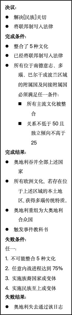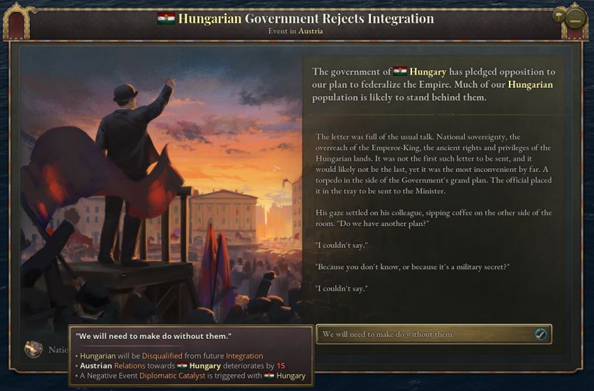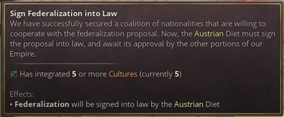 提案被接受后,所有奥地利王冠领地与共主邦联将收到各自的日志,允许他们选择是协助还是对抗大奥地利的诞生。如果某个邦联国家与奥地利关系紧张而独立倾向很高(说的就是匈牙利),那么或许你需要满足其文化群体的特定要求,甚至需要以妨害其他文化群体的利益为代价,来换取其合作。