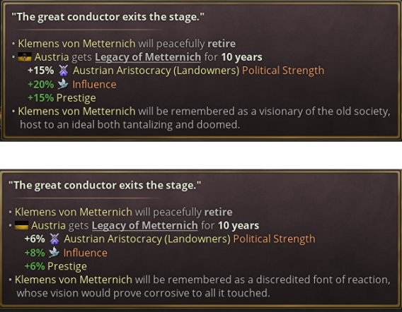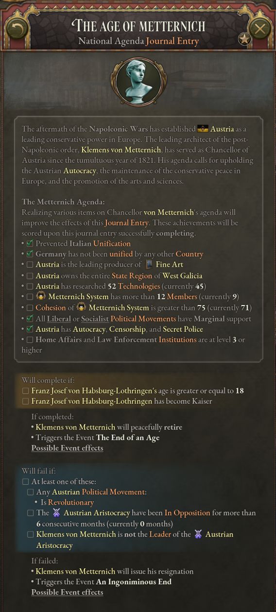 该日志拥有十个子目标,围绕梅特涅的外交与内部事务的野心展开。如果玩家决定追求他的议程,维持奥地利欧洲保守主义核心的地位,那么他将随子目标的完成数量而变得更有力量——并为这一段冲突的历史带来一种不同的分支走向。