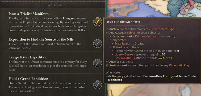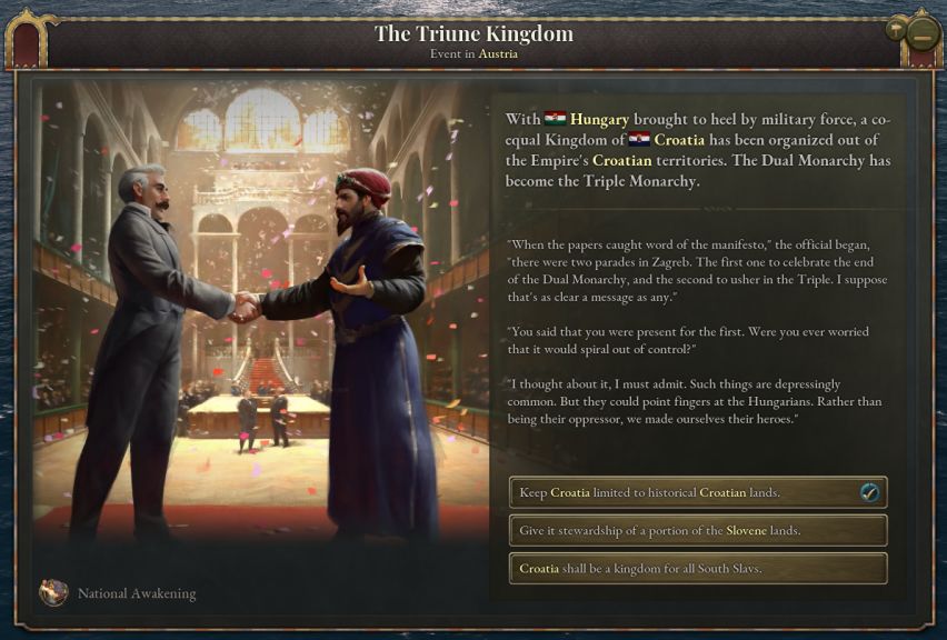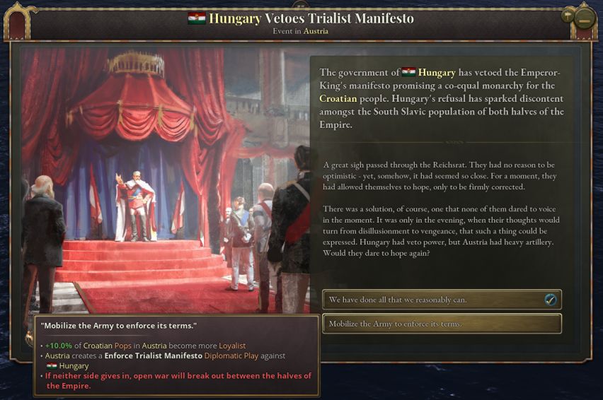如果匈牙利同意宣言——或者被通过外交博弈强制执行同意三元宣言的战争目标——那么克罗地亚将成为奥地利的附属国,二元君主制也将转变为三元君主制。