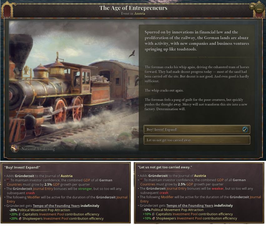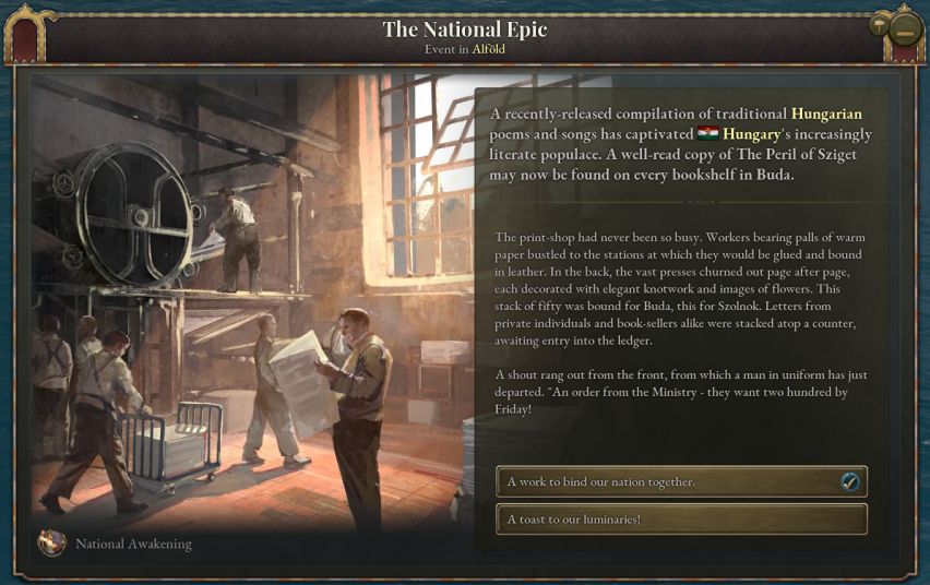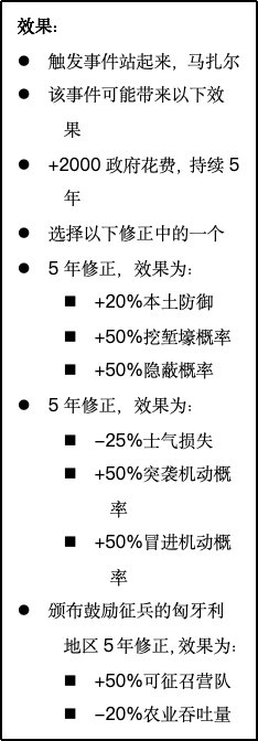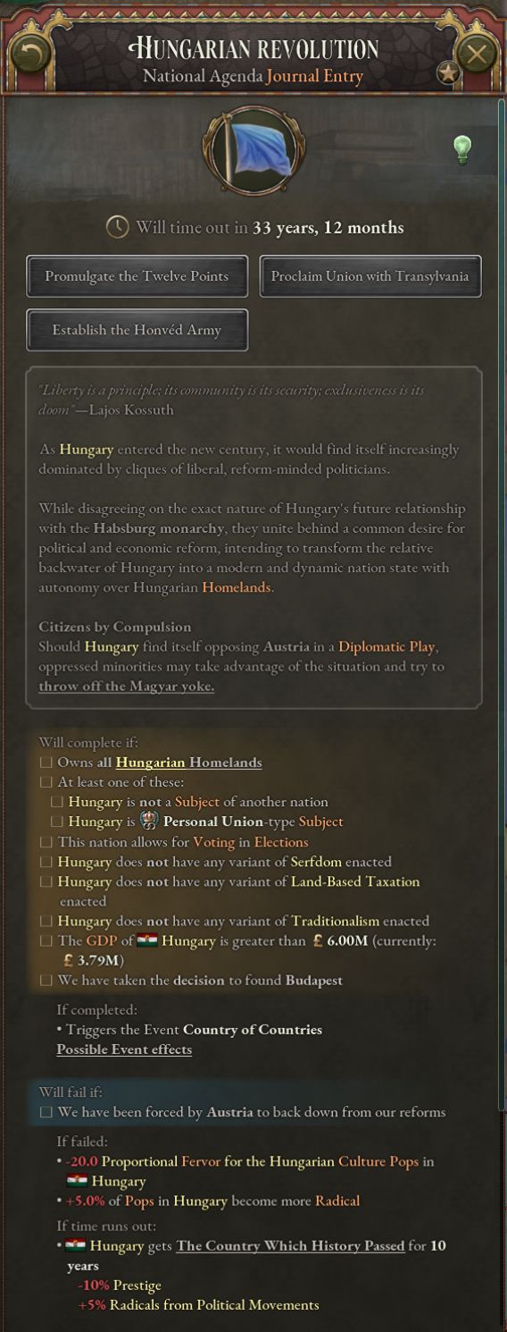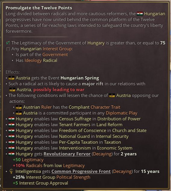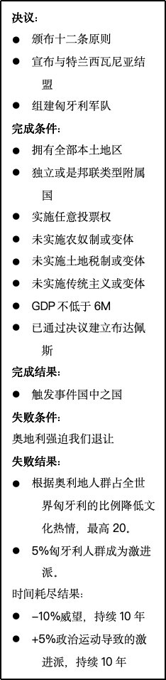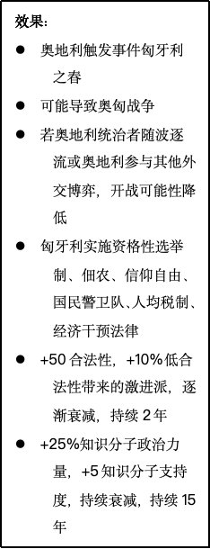 匈牙利玩家将可以通过日志提供的决议实现快速自由化。这么做会导致奥地利与匈牙利之间出现严重裂痕,因此玩家需要谨慎选择发动革命的时机。