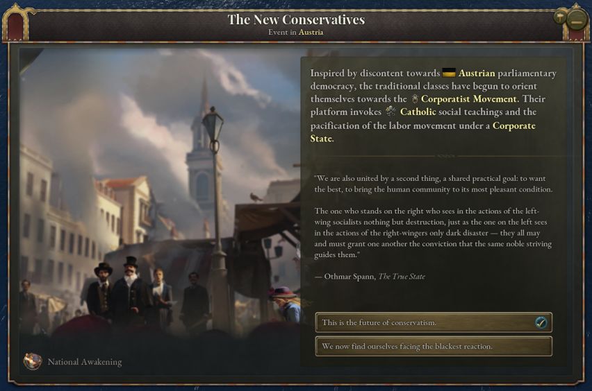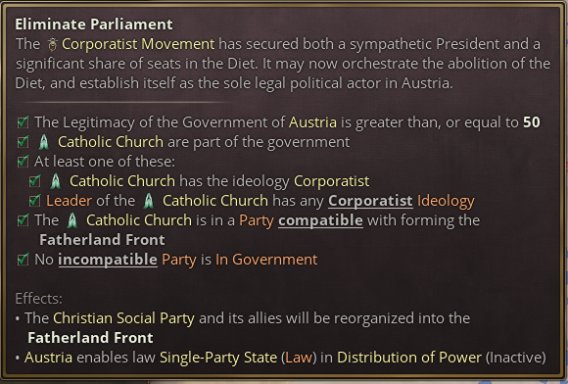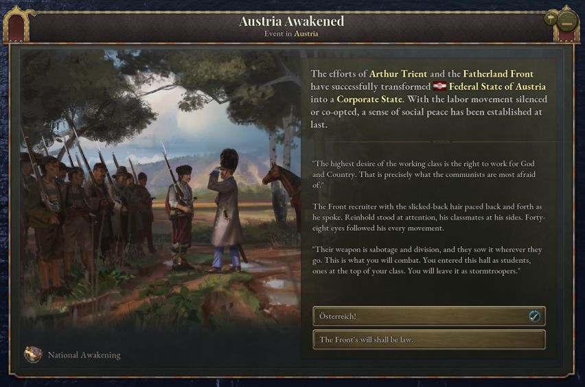 从历史上看,奥地利法西斯政权的建立发生在游戏尾声时期。奥地利已经失去了他的皇帝,成为了共和国。不过也有观点认为,奥地利帝国的覆灭并非奥地利法西斯主义兴起的必要条件。法团倾向在基督教社会党内部根深蒂固;另外,在奥匈帝国时期,反民主情绪也并非罕见。1907年,奥地利因社会民主党支持的一场大罢工而实行了男性普选权,奥地利保守派与军方对此十分不满。1912年,奥地利军方推动了一项法律,赋予其广泛的战时权力,包括对生产的直接控制。这些法律,与1867年宪法中允许颁布法令的规定以及极端反动的军事体制的共同作用,使第一次世界大战爆发后奥地利成为了军事独裁政权。也因此,从统一的奥地利帝国到一个更大的法团奥地利帝国也并非完全不可能。