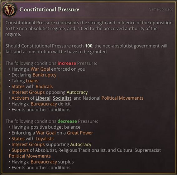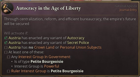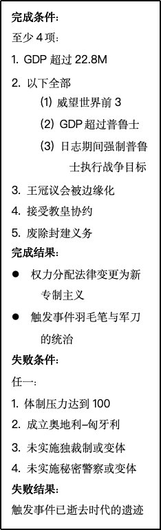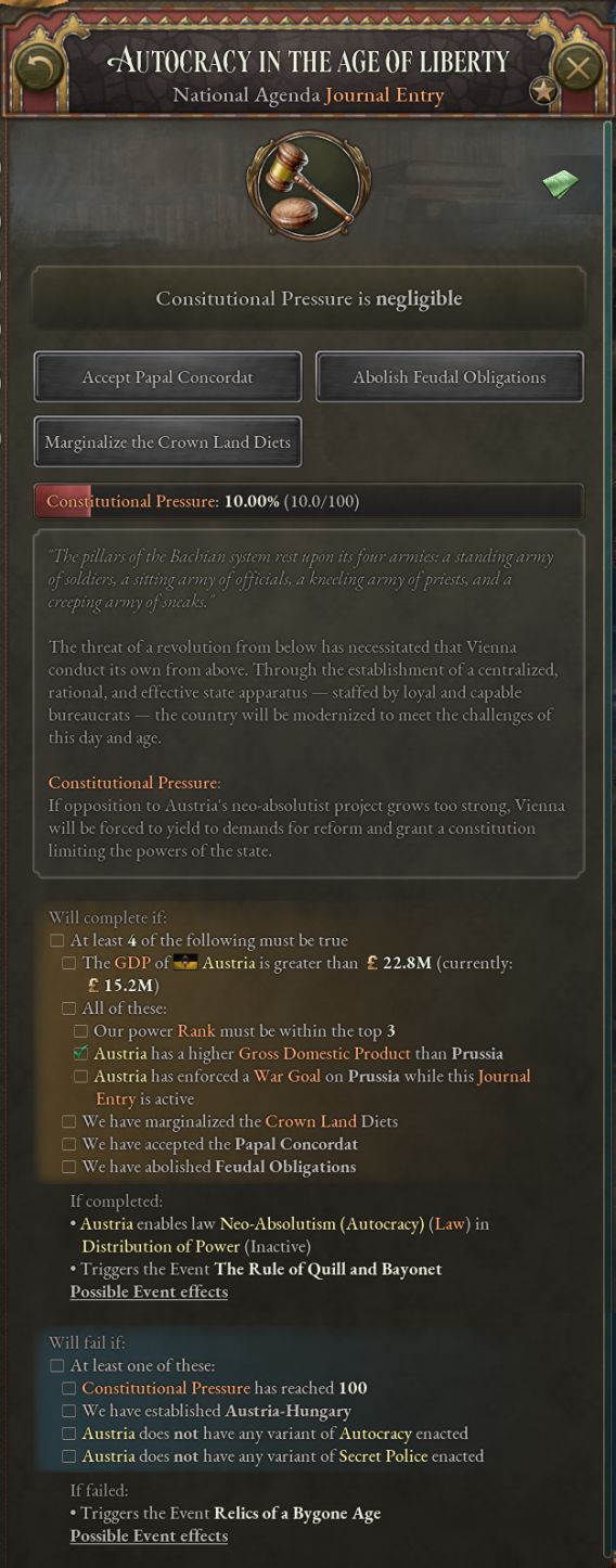 完成该日志的条件是在体制压力过大前完成足够多的目标。体制压力是对历史上导致新专制主义政权垮台的诸多因素的抽象化表述,这些因素包括匈牙利政治体制的消极抵抗与对普鲁士、意大利的军事失败。