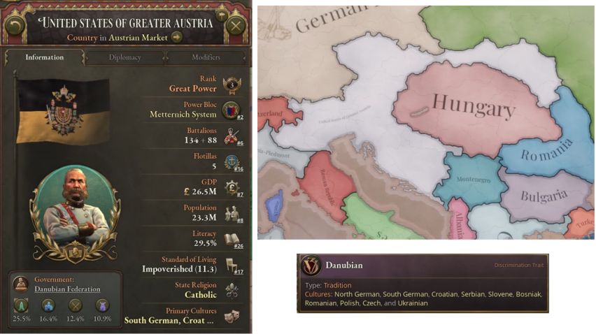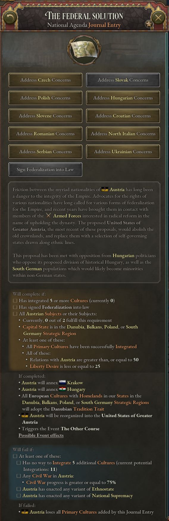 联邦解决方案日志允许创建多种多样的大奥地利合众国。若你想要成功,你需要建立愿意参与该项目的民族联盟,并让你的共主联邦、王冠领地与傀儡国参与进来。