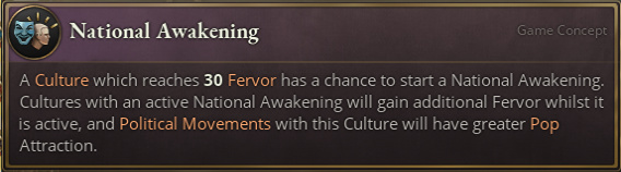 每个文化在整局游戏中最多觉醒一次,当文化拥有30点文化热情后就可能发生。民族觉醒将引发一场民族运动,提高民族运动的吸引力并在其存在期间进一步提高文化热情。多民族帝国或许需要在附属国文化觉醒时多留心。