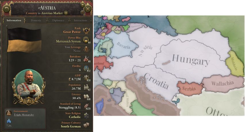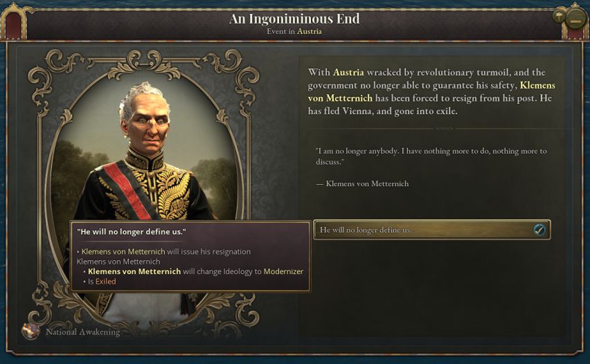 当然,这并不是说梅特涅无足轻重。19世纪是欧洲权力最集中的时期,忽视人对这个时代的进程起到的作用也是一种矫枉过正。在我们游戏开始的时间之前,他在欧洲外交与奥地利政策的制定过程中发挥了不可或缺的个人作用。1836年的小型政变后,他的影响力下滑,但他仍能在整个1840年代阻止卡尔大公担任奥地利军队的最高统帅并在1846年促成对克拉科夫的吞并。公平的说,他在秘密国际会议中的大部分时间都处于政治困境中,但也并非“无权无势”。