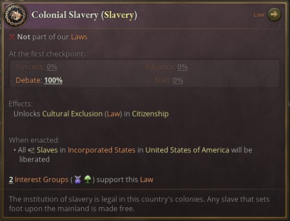 游戏开始时,许多欧洲国家已经在本土领土内禁止或选择不承认奴隶制的存在了。但它们在海外殖民地仍然保留了奴隶制。殖民地奴隶制法律反映了这种情况,允许国家在公民看不见的地方继续实行奴隶制。此法律等同于在未整合地区实行债务奴隶制,而在已整合地区使用禁止蓄奴。当此法律生效时,未整合地区的低生活水平人群会缓慢的被奴役。