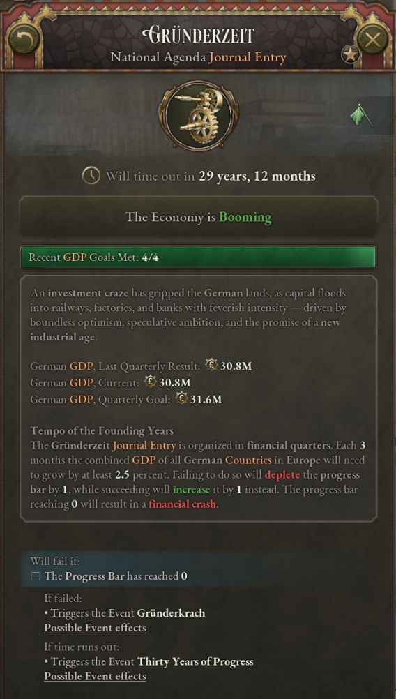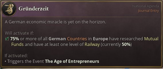 奠基时期日志是由德意志诸国共有的日志,代表该时期自由而狂野的投机现象。当该日志生效时,所有德意志国家将共同服务于其目标——每季度共同GDP增速达到2.5%。在该时期开始时,参与者可以自主选择参与该时期的程度,获得不同的资本家/店主投资加成,并承担相应风险。
