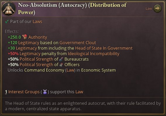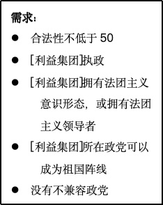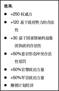 接受法团主义计划则简单的多。只需要一次点击,国家会立即变成一党制国家。为了体现祖国阵线奇特而模糊的身份,这个按钮会将国家元首所属的政党转变为祖国阵线。