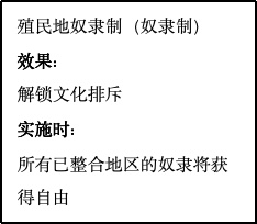 殖民地奴隶制法律在游戏开局时在西班牙、葡萄牙、丹麦、尼德兰与法国实施。