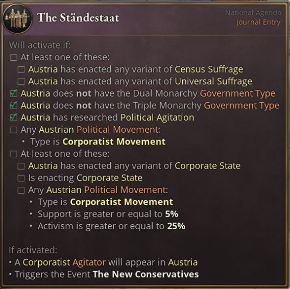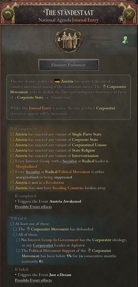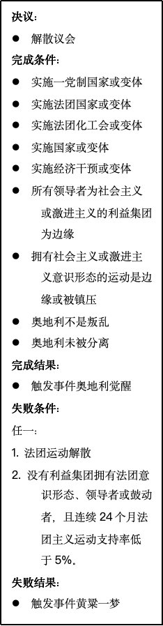 法团奥地利日志适用于既未形成二元帝国或三元帝国,也未联邦化的民主奥地利。一旦该日志生效,玩家可以选择对抗日益崛起的法团主义,或者接受其议程。