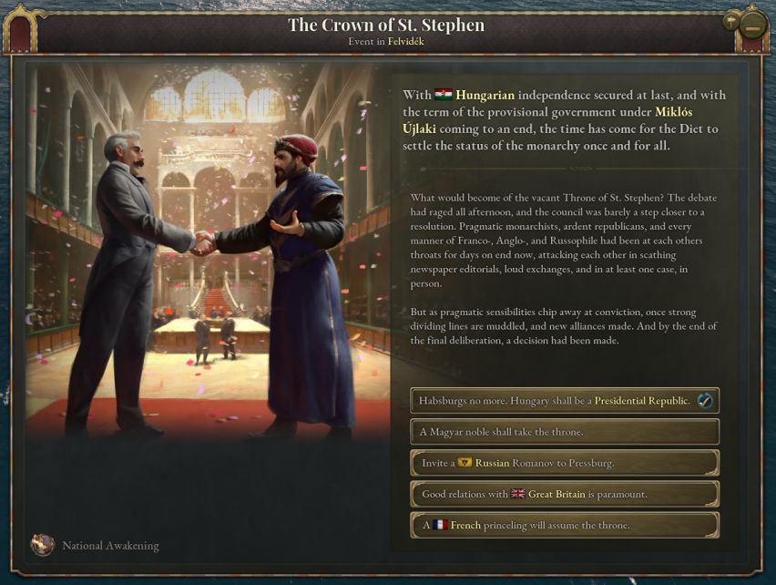 成功确保匈牙利独立之后,玩家可以选择一位统治者,从欧洲的显贵家族中进行选择。