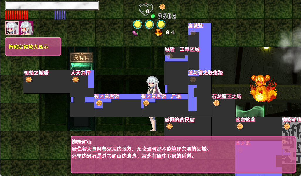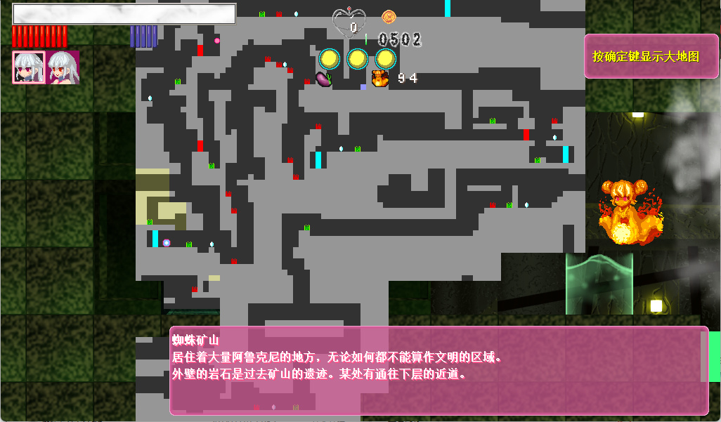 右上角是小地图,可以按SHIFT进行样式切换。然后看主角旁边是游戏里最重要的三样东西,右边白色的宝石是存档点,左边的红色条就是回血用的,绿色的是回蓝条用的,这三样东西遍布整张地图,所以难度还是比较简单的。